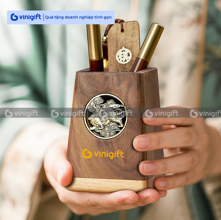 Bề mặt gỗ lý tưởng để hộp đựng bút khắc laser logo, hoặc in UV trực tiếp tên thương hiệu, thông điệp tri ân hoặc lời chúc ý nghĩa. Mỗi sản phẩm vì thế trở nên độc đáo, mang giá trị cá nhân hóa cao – rất phù hợp làm quà tặng doanh nghiệp, hội thảo, sự kiện…
