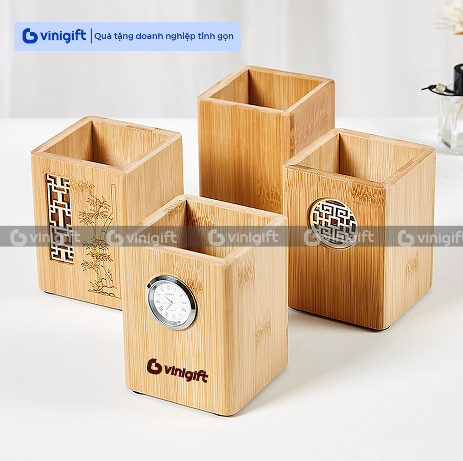 Hộp đựng bút gỗ có nhiều kiểu dáng: từ hình trụ đứng, hộp vuông đơn giản đến các mẫu chia ngăn đa năng. Có thể kết hợp khay đựng danh thiếp, điện thoại hoặc đồng hồ. Gọn gàng – tiện lợi – đầy cảm hứng sáng tạo cho không gian làm việc.