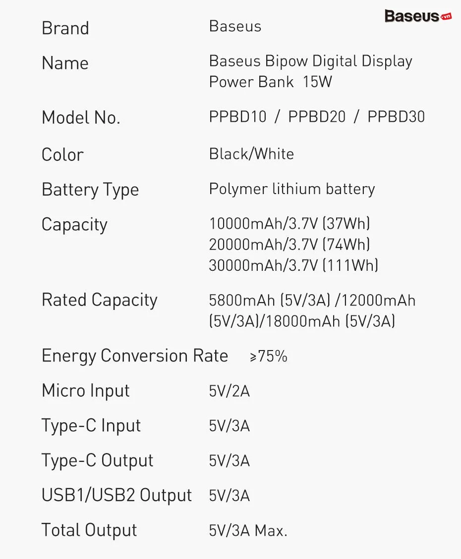 - Output: Type-C (15W), 2USB (15W)