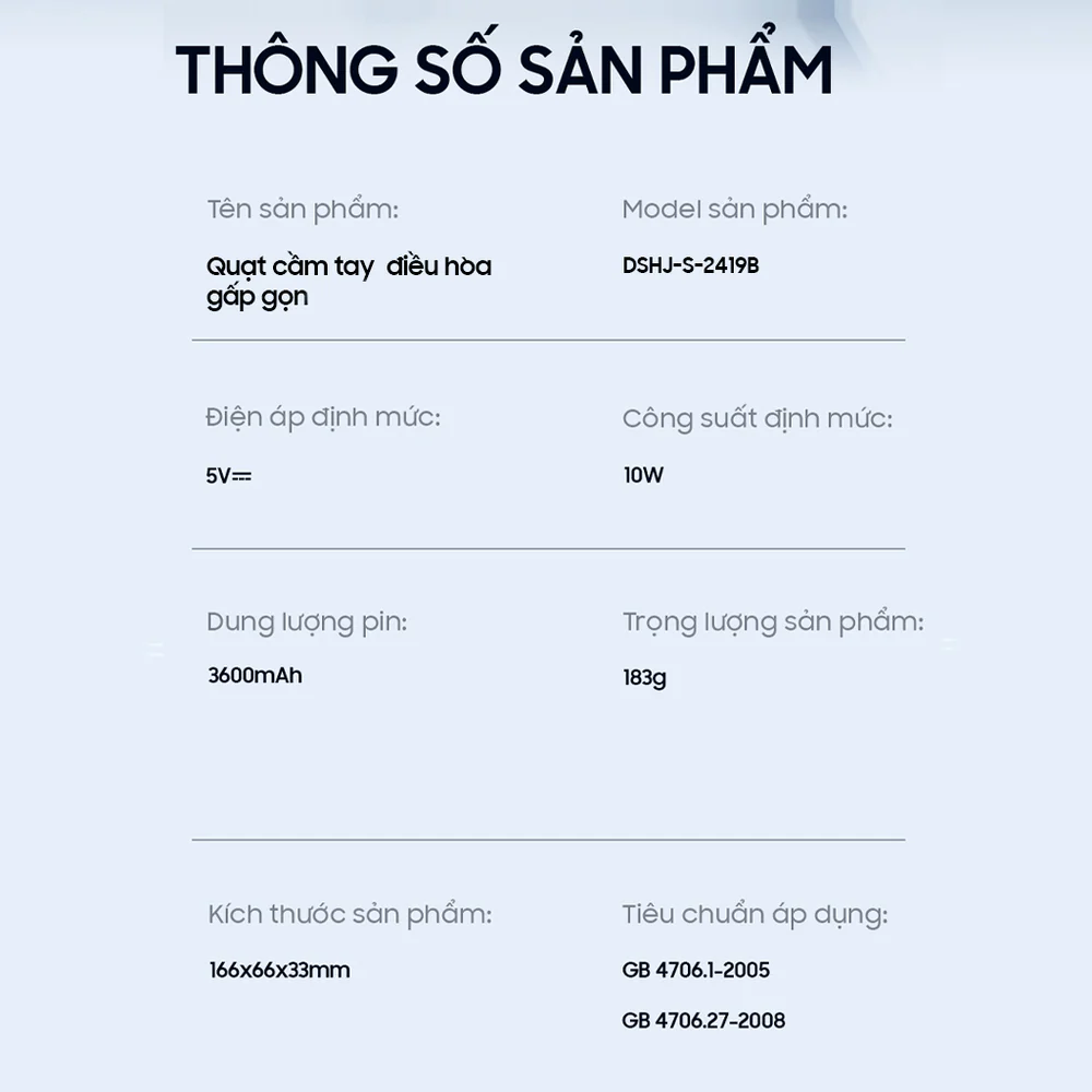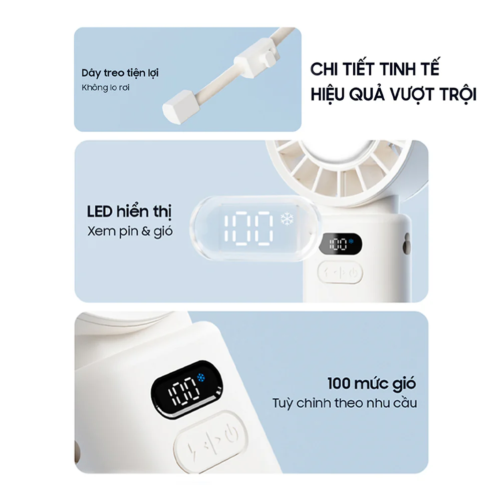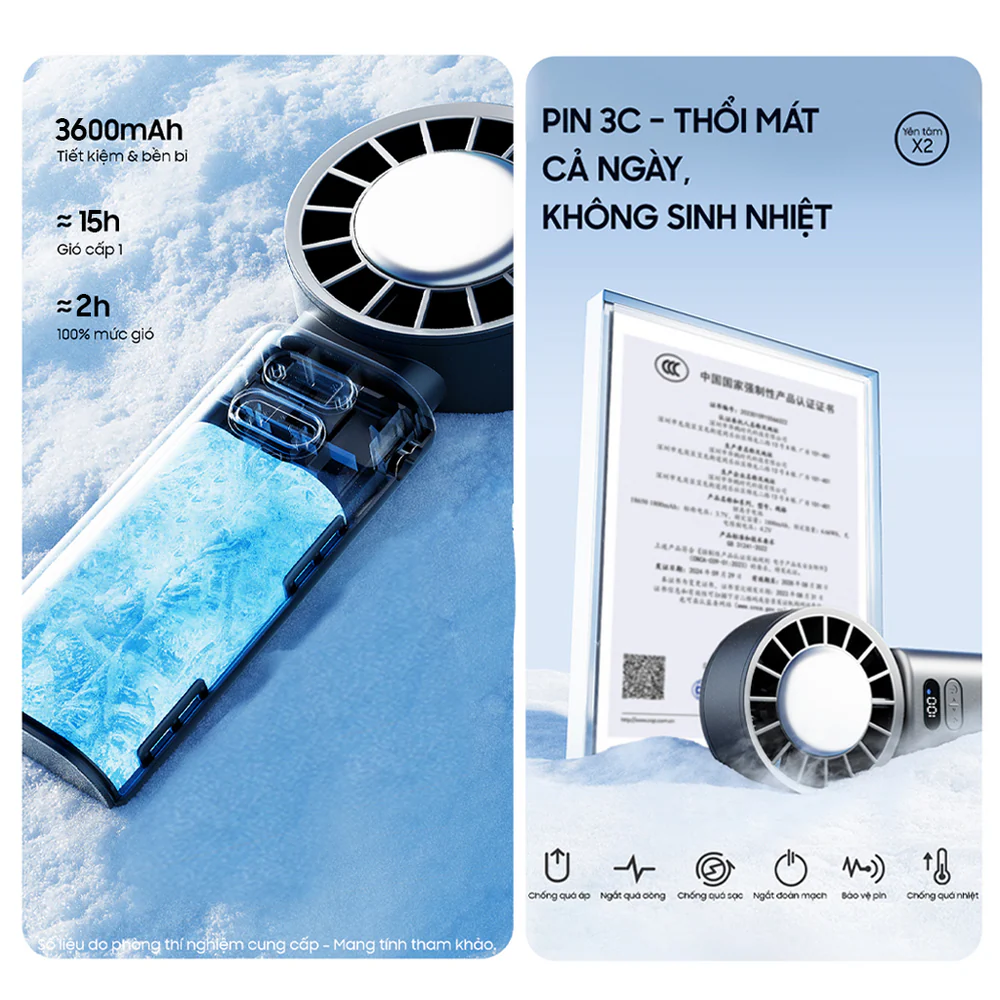 Dung lượng 3600mAh, dùng liên tục đến 15h ở chế độ gió thường, và ~2,5h ở chế độ làm lạnh.